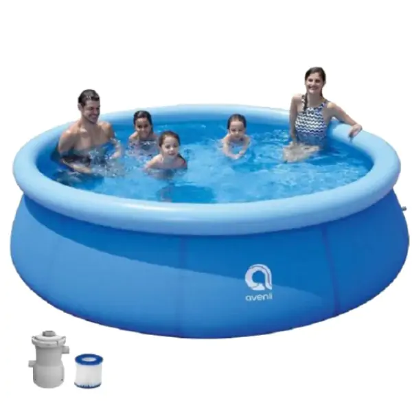 • Ovaj samostojeći bazen okruglog oblika sa pumpom predstavlja idealno rešenje za brzo i jednostavno postavljanje osveženja u vašem dvorištu ili bašti, bez potrebe za posebnim alatom ili komplikovanom montažom. Zahvaljujući inovativnom sistemu, bazen se samouspravlja dok se puni vodom, dok vazdušni prsten na naduvavanje obezbeđuje stabilnost i čvrstoću konstrukcije. Izrađen je od troslojnog, izuzetno otpornog PVC materijala pojačane otpornosti na UV zračenje, što garantuje dugotrajnost i pouzdanost tokom čitave letnje sezone. U kompletu se isporučuje pumpa koja omogućava efikasnu cirkulaciju i održavanje čistoće vode, čineći održavanje bazena jednostavnim i bezbrižnim.