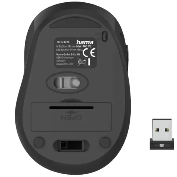 • Hama MW-400 V2 crni bežični optički miš sa šest tastera i USB nano risiverom pruža praktično i pouzdano korišćenje računara. Minijaturni USB-A prijemnik olakšava instalaciju i ne zauzima prostor. Miš koristi 2.4 GHz RF vezu za stabilan prenos podataka na udaljenosti do 10 m, dok je osetljivost podesiva na 800, 1200 ili 1600 dpi. Poseduje tastere za kontrolu internet pretraživača (Browser) i ON/OFF funkciju. Smart-Link tehnologija omogućava jednostavno pokretanje i povezivanje uređaja. Kompatibilan je sa operativnim sistemima Windows 11, 10, 8 i 7, a napaja se sa dve AAA Micro baterije. Dimenzije miša su 6,5 x 9,6 x 4,2 cm, masa 80 g.