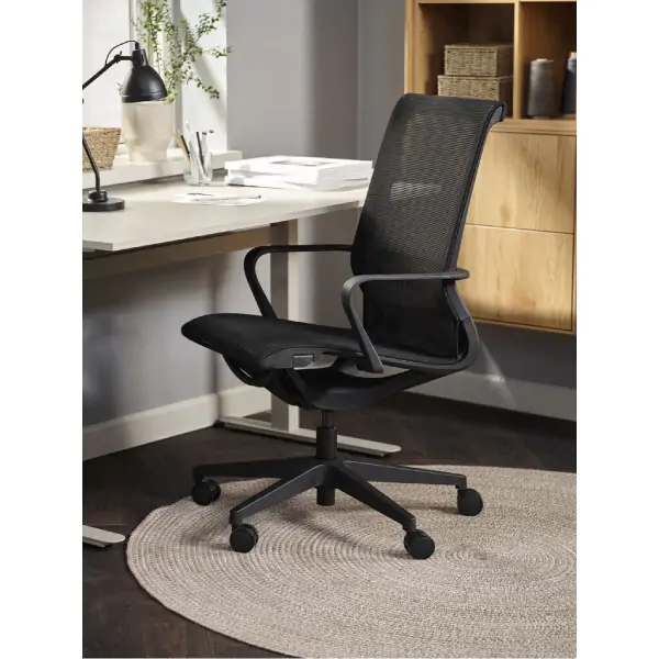 • FOLBY kancelarijska stolica u crnoj boji dizajnirana je za udobnost i podršku tokom celog radnog dana, sa prozračnom mrežastom tkaninom koja omogućava bolji protok vazduha. Opremljena je kliznim nagibnim mehanizmom koji prati pokrete tela, mogućnošću zaključavanja naslona u uspravnom položaju za stabilnost, podesivom visinom sedišta (50–59 cm) i sigurnosnim točkićima koji se automatski zaključavaju kada stolica nije u upotrebi. Dimenzija 57 x 62 x 107–116 cm, testirana je do 110 kg. Isporučuje se u jednom paketu, težine 11 kg, i potrebno je montirati je.