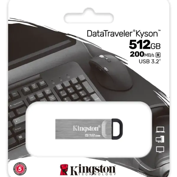 • Kingston DataTraveler Kyson USB fleš memorija sa kapacitetom od 512 GB pruža brzo i pouzdano rešenje za čuvanje svih vrsta multimedijalnih sadržaja, uključujući slike, filmove, muziku i druge fajlove. Fleš memorija koristi USB 3.2 Gen 1 standard, omogućavajući brzinu čitanja do 200 MB/s i brzinu pisanja do 60 MB/s, što olakšava efikasno prebacivanje i pristup podacima. Metalno kućište pruža izdržljivost i moderan izgled, dok otvor za kačenje omogućava jednostavno pričvršćivanje na ključeve ili torbicu, čineći uređaj praktičnim za nošenje. Dimenzije fleša su 39 × 12,6 × 4,9 mm, a masa od samo 4 g čini ga izuzetno laganim i kompaktim. Kompatibilan je sa Windows 10, 8.1, 8, Mac OS v.10.10.x i novijim, Linux v.2.6.x i novijim, kao i Chrome OS™, što ga čini univerzalnim rešenjem za različite uređaje i operativne sisteme. Kingston DataTraveler Kyson kombinuje kapacitet, brzinu, praktičnost i moderan dizajn u jednom elegantnom i pouzdanom paketu.