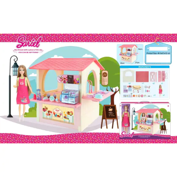Set uključuje kućicu-poslastičarnicu dimenzija 29 x 37 x 34 cm, razne vrste torti, kolača i sladoleda, sokovnik sa čašama punim osvežavajućih napitaka i vitrinu za izlaganje slatkih poslastica, što pruža realističan doživljaj i beskrajne mogućnosti igre.
