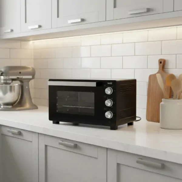 • Ova mini pećnica sa termostatom predstavlja praktično i funkcionalno rešenje za svakodnevno kuvanje u manjim kuhinjama, studentskim domovima, vikendicama ili kao dodatni uređaj u većem domaćinstvu. Namenjena je za pripremu toplih sendviča, lazanja, mini pizza, pečenje mesa, povrća i gotovih smrznutih proizvoda, zahvaljujući zapremini od 30 litara koja nudi dovoljno prostora za porodične obroke bez nepotrebnog zauzimanja prostora. Snaga od 1600 W omogućava brzo zagrevanje i ravnomerno pečenje, dok termostat podesiv do 230°C omogućava precizno prilagođavanje temperature vrsti jela koje pripremate. Tajmer do 60 minuta olakšava rad automatskim isključivanjem po isteku vremena, pružajući dodatnu sigurnost i bezbrižnost. Pećnica nudi više režima rada – mogućnost korišćenja gornjih i donjih grejača, ventilatora za ravnomernu cirkulaciju toplote i ražnja sa motorom za pečenje piletine i većih komada mesa. Ventilator obezbeđuje da hrana bude ravnomerno pečena spolja i sočna iznutra. Vrata sa duplim staklom zadržavaju toplotu u unutrašnjosti i povećavaju bezbednost tokom rada, dok dobro izolovano metalno kućište dodatno doprinosi stabilnoj temperaturi pečenja. U pakovanju se isporučuju pleh za pečenje, rešetka i ražanj sa viljuškama za fiksiranje hrane, čime je pećnica odmah spremna za upotrebu.