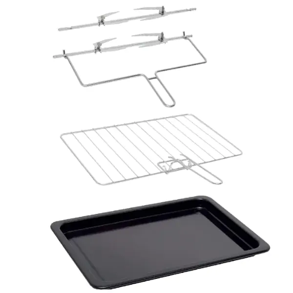• Pribor: Mrežica za pečenje, tacna (pleh), drška za tacnu i mrežicu, ražanj, 2 viljuške za fiksiranje hrane