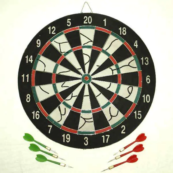 • dvostrana meta za pikado s različitim stepenima težine, 6 strelica s metalnim vrhom, alkica za obesiti.