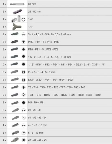 Spoljni hekasagonlni - prema DIN 3126 / ISO 1173 - C 6,3.Može se koristiti ručno ili sa električnim odvijačem.Uključuje bitholder i 1/4 \" adapter- utičnicu.Uredno uređeni set popularnog 1 / 4 \"bita.Od specijalnog čelika.U trajnoj plastičnoj kutiji.