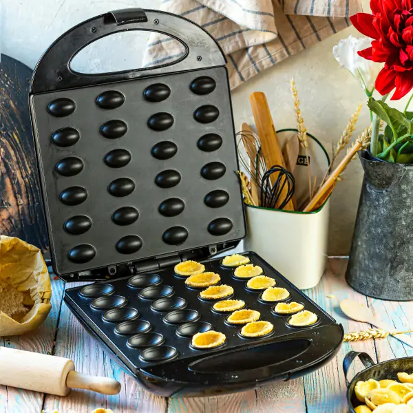 • Uređaj za pečenje kolačića u obliku kikirikija sa mogućnošću punjenja slatkim ili slanim krema po želji donosi zabavu i ukus pravog domaćeg poslastičarenja. Zahvaljujući XL veličini, u jednom ciklusu možete istovremeno ispeći čak 24 polovine kikirikija, što ga čini idealnim za porodične sastanke ili veće proslave. Kućište od bakelita obezbeđuje izdržljivost i otpornost na visoke temperature, dok toplotno izolovane ručke štite od slučajnih opeklina i omogućavaju sigurno rukovanje tokom rada. Ploče sa neprijaljivom prevlakom olakšavaju uklanjanje kolačića i brzo čišćenje posle upotrebe, a hermetički poklopac sa bravicom osigurava ravnomerno pečenje i održavanje optimalne unutrašnje temperature. Visoka snaga uređaja – do 1600 W – omogućava brzo pečenje: samo za 2 minuta možete pripremiti 12 kolačića, što značajno ubrzava pravljenje većih količina poslastica. Indikatorsko svetlo jasno pokazuje kada je uređaj spreman za upotrebu, dok antiklizne nogice osiguravaju stabilan položaj na bilo kojoj kuhinjskoj površini. Kompaktan, funkcionalan i jednostavan za korišćenje, ovaj kolačić-mašina donosi kreativnost i zadovoljstvo pravljenja unikatnih domaćih slatkiša prilagođenih vašem ukusu.