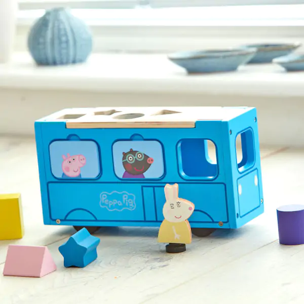 • Uključeni elementi: Autobus, drvene figure likova (Peppa, George, Suzy, itd.), drveni oblici za igru (krug, kvadrat, trougao, zvezda)