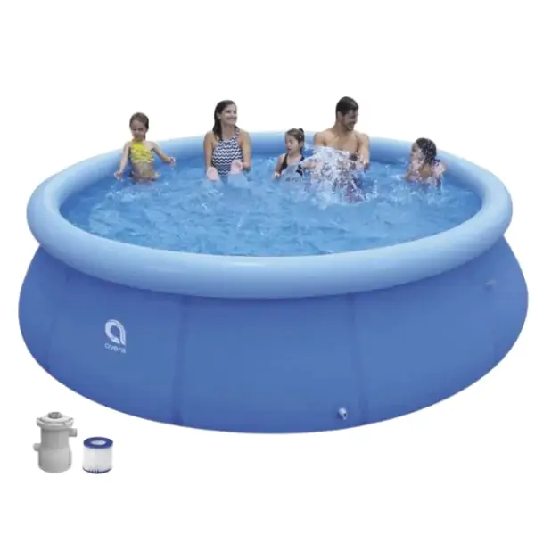 • Ovaj samostojeći bazen okruglog oblika sa pumpom predstavlja idealno rešenje za brzo i jednostavno postavljanje osveženja u vašem dvorištu ili bašti, bez potrebe za posebnim alatom ili komplikovanom montažom. Zahvaljujući inovativnom sistemu, bazen se samouspravlja dok se puni vodom, dok vazdušni prsten na naduvavanje obezbeđuje stabilnost i čvrstoću konstrukcije. Izrađen je od troslojnog, izuzetno otpornog PVC materijala pojačane otpornosti na UV zračenje, što garantuje dugotrajnost i pouzdanost tokom čitave letnje sezone. U kompletu se isporučuje pumpa koja omogućava efikasnu cirkulaciju i održavanje čistoće vode, čineći održavanje bazena jednostavnim i bezbrižnim.