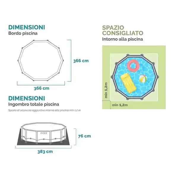 • Održavanje bazena je jednostavno i ekonomično. Redovno proveravanje pH vrednosti, upotreba kompatibilne Intex filter-pumpe i povremeno mehaničko čišćenje zidova osiguravaju čistu i bistru vodu tokom celog leta. Preporučuje se postavljanje bazena na ravnu i mekanu površinu poput trave ili zaštitnog bazenskog tepiha, kako bi se očuvala stabilnost i produžio vek trajanja konstrukcije. Kada se bazen ne koristi, zaštitna pokrivka sprečava ulazak prljavštine, lišća i insekata.