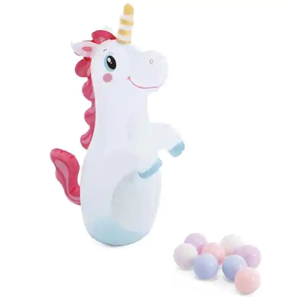 • Igralište na naduvavanje „Dvorac jednoroga“ Intex (kataloški broj 56148NP) pravi je hit za decu od 2. godine i starije! Ova dečja naduvana igraonica kombinuje zabavu i osveženje tokom toplih letnjih dana. U kompletu se nalaze tobogan sa mekim oblogom, prskalica u obliku dvorca koja se priključuje na baštensko crevo, bokserska figura Bop Bag u obliku jednoroga i 8 mekih loptica za bacanje kroz obruč – sve to unutar sigurnog i čvrstog Intex bazena na naduvavanje. Idealno za dvorište, rođendanske zabave ili porodične dane, ovo igralište za decu stimulira motoričke veštine, koordinaciju i maštu.