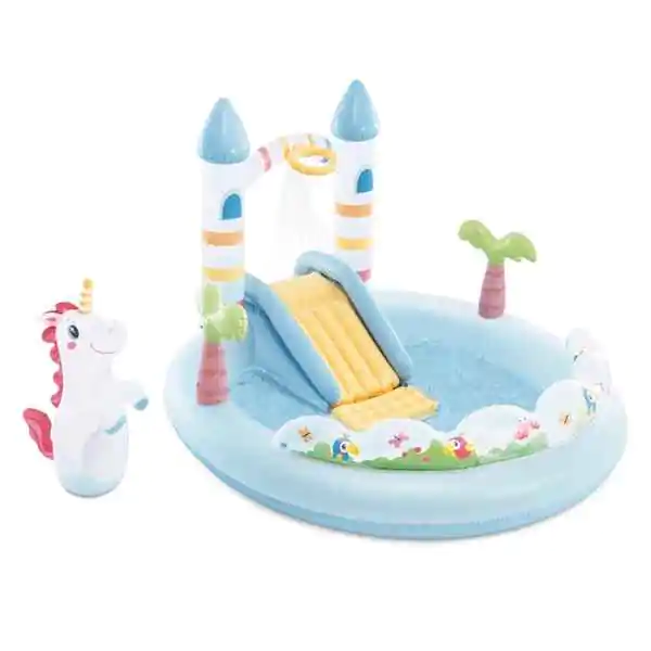 • Naduvani bazen sa toboganom brzo se postavlja i opremljen je ispustnim ventilom za lako pražnjenje. Brend Intex garantuje visok kvalitet, bezbednost i izdržljivost PVC materijala otpornog na pucanje. Tražite najbolji naduvani dvorac za decu, igraonicu sa prskalicom ili sigurno letnje igralište? „Dvorac jednoroga“ je savršeno rešenje! Dostupan u vodećim prodavnicama, ovaj dečji bazen sa toboganom i igrama osigurava sate bezbrižne zabave pod nadzorom odraslih