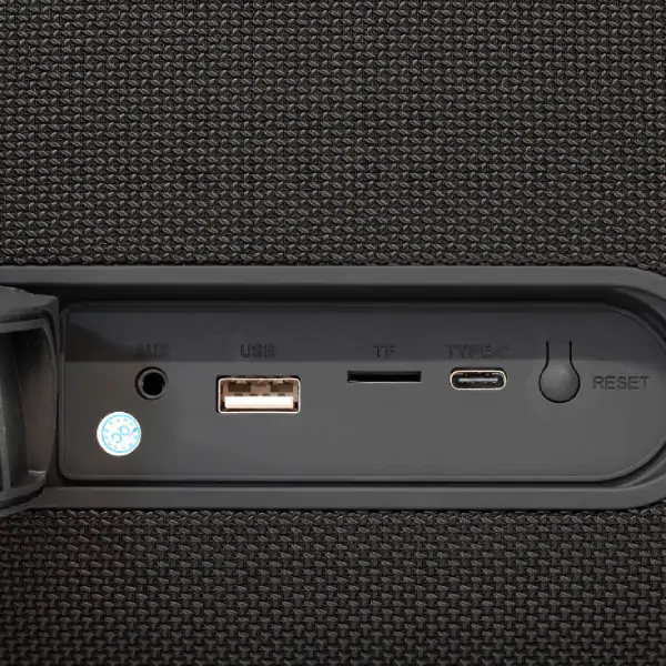 • Ova kompaktna Boom-Box zvučna kutija donosi snažan zvuk i atraktivne RGB svetlosne efekte koji se mogu isključiti po želji, uz modernu soft touch kontrolnu ploču za jednostavno upravljanje. Zahvaljujući kompaktnoj izvedbi i zaštiti od vode, idealna je za upotrebu na izletima, letovanju, u bašti ili čak u toku rada, pružajući zabavu gde god da se nalazite. Ugrađeni akumulator se jednostavno puni preko USB-C utičnice (adapter se kupuje zasebno), dok se bežično putem Bluetooth-a ili žično može povezati sa mobilnim telefonom, računarom ili multimedijskim plejerom. Za reprodukciju muzike direktno sa memorije, uređaj poseduje USB utičnicu koja podržava MP3 format. Zahvaljujući bežičnoj TWS (True Wireless Stereo) tehnologiji, moguće je upariti dva identična uređaja u stereo sistem za još impresivniji zvučni doživljaj. U paketu se isporučuju 3.5 mm i USB-C kabl, kao i praktičan kaiš za lakše prenošenje.