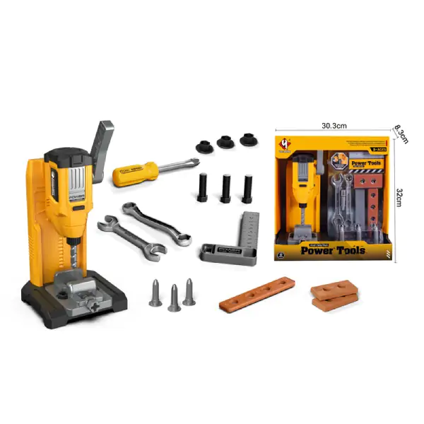 • Uključeni elementi: Stolna bušilica (sa steznom glavom, ručicom, dugmetom), burgije (plastične), ključ za burgije, čekić, šrafciger, možda steg