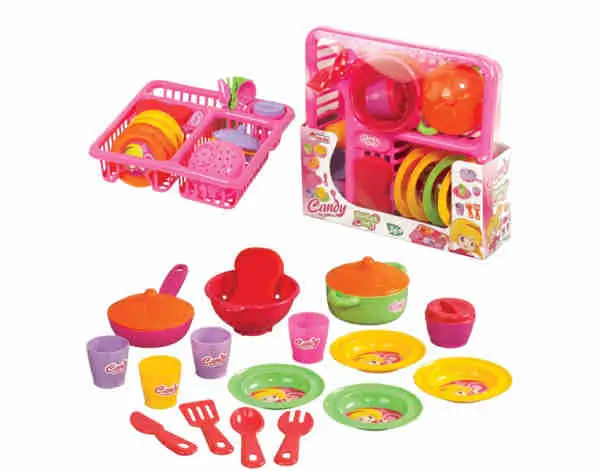 • Set sadrži cedijku za sudove, tanjire,čaše,pribor za jelo i drugo.