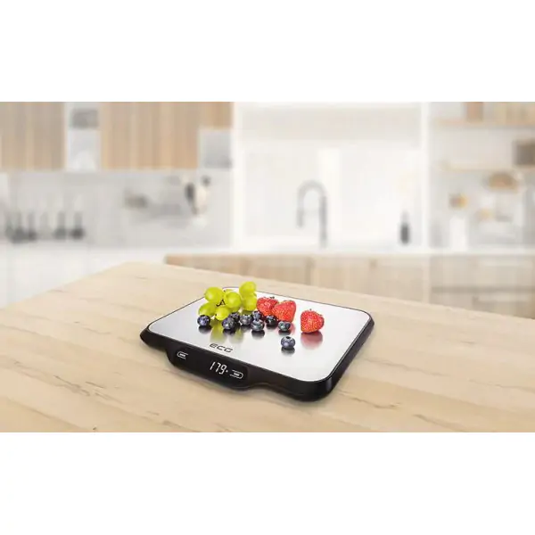 • ECG kuhinjska vaga u elegantnom dizajnu od nerđajućeg čelika donosi preciznost, pouzdanost i moderan izgled u vašu kuhinju, čineći svakodnevno kuvanje i pripremu hrane jednostavnijim i tačnijim. Sa maksimalnim kapacitetom od 15 kg i preciznošću merenja od 1 g, ova digitalna vaga idealna je za merenje sastojaka od najmanjih količina do težih namirnica. Veliki LED displej omogućava lako očitavanje izmerenih vrednosti, dok intuitivne funkcije Add and weigh (dodavanje i merenje) i TARA (resetovanje) olakšavaju merenje više sastojaka u istoj posudi bez komplikovanog računanja. Touch kontrola pruža savremeno i jednostavno upravljanje, a površina od nerđajućeg čelika je otporna na ogrebotine i laka za čišćenje. Protivklizne stopice obezbeđuju stabilnost tokom upotrebe, dok funkcija automatskog isključivanja (auto-off) produžava vek trajanja baterija (4 x 1,5 V AA). Kompaktnih dimenzija i srebrne boje, ova vaga se lako uklapa u svaki kuhinjski prostor.