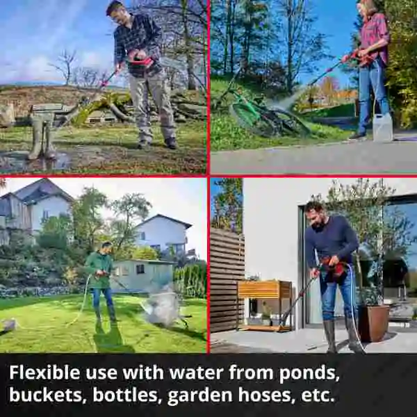 • Multifunkcionalna mlaznica sa četiri podešavanja omogućava izbor između usmerenog mlaza, širokog raspršivanja, režima za zalivanje i rotacionog mlaza za temeljno čišćenje. Perač se može priključiti direktno na baštensko crevo ili koristiti usisno crevo dužine 5 metara sa filterom za crpljenje vode iz kante, rezervoara, jezera ili ribnjaka.
