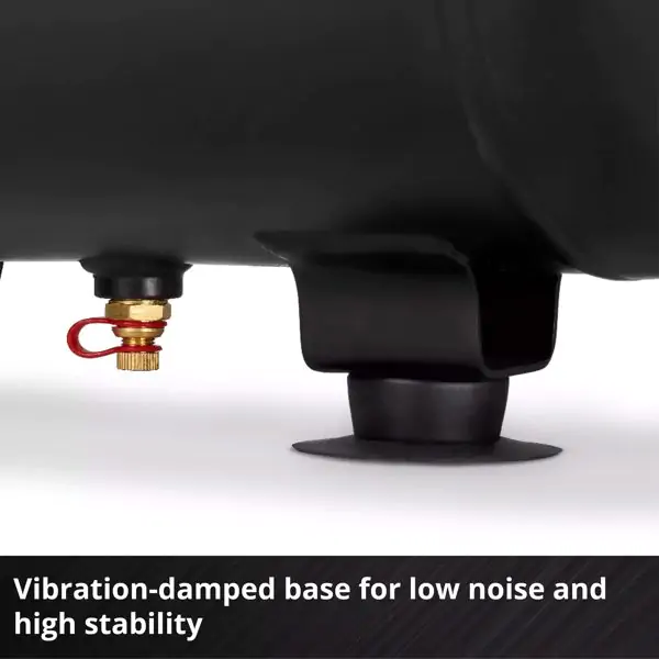 • Ugrađeni regulator pritiska omogućava precizno podešavanje radnog pritiska do maksimalnih 8 bar, dok pregledan manometar pruža jasnu kontrolu podešene vrednosti tokom rada. Stabilnost uređaja obezbeđuje postolje sa prigušenjem vibracija, što doprinosi sigurnijem radu i manjem prenosu vibracija na podlogu. Kondenzacioni ventil za ispuštanje vode iz rezervoara omogućava jednostavno održavanje i dugotrajnu pouzdanost.