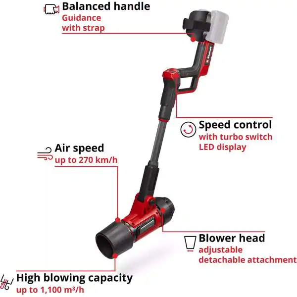 Akumulatorski duvač TE-CB 18/180 Li-Solo Power-X-Change EinhellČlan porodice Pover X-ChangeDvostepeno podešavanje brzine za svestranu upotrebuP ...