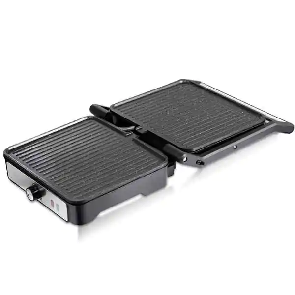 • Raf električni gril R.2301 snage 2000W donosi profesionalno iskustvo pečenja direktno u vašu kuhinju. Savršen za pripremu mesa, povrća, sendviča i drugih omiljenih jela, ovaj kompaktni električni gril obezbeđuje brzo i ravnomerno pečenje zahvaljujući obostranom zagrevanju. Zahvaljujući otvaranju do 180 stepeni, može se koristiti i kao ravna roštilj ploča – idealno za doručak, ručak ili brzi večernji obrok.