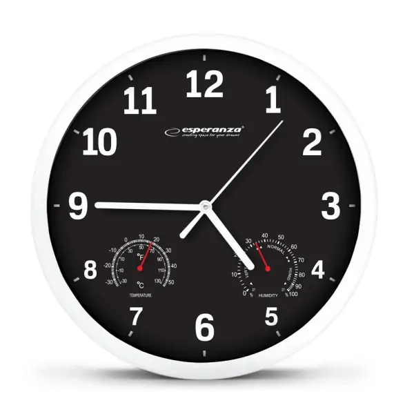 • Zidni sat ESPERANZA LYON više je od jednostavnog pokazivača vremena – to je sveobuhvatna dekorativna i funkcionalna stanica za vaš prostor. Pored preciznog kazaljkačkog mehanizma, ovaj sat integriše digitalne senzore koji kontinuirano mere i prikazuju ambijentalnu temperaturu i vlažnost vazduha, pružajući vam korisne podatke o uslovima u okruženju. Njegov klasičan, prefinjeno jednostavan dizajn lako se uklapa u bilo koji enterijer, od savremenog stana do profesionalne kancelarije, prodavnice ili restorana, dodajući notu stila bez preopterećenja. Izrađen od kvalitetnih materijala i sa pažljivim zanatskim detaljima, sat odiše čvrstinom i dugotrajnošću, čineći ga ne samo korisnim dodatkom već i pouzdanim, estetski privlačnim elementom u vašem svakodnevnom ambijentu.