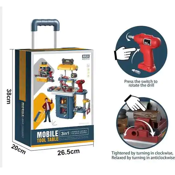 • Dečiji radni sto sa alatom 3-u-1 – kofer, sto i radna klupa sa električnom bušilicom