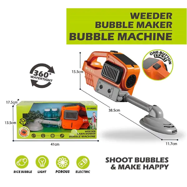 • Ovaj trimer sa sapunicom donosi uzbudljiv svet zabave sa svetlosnim i zvučnim efektima, pretvarajući obično oponašanje odraslih u čarobnu predstavu. Savršen je za decu koja žele da imitiraju odrasle i učestvuju u vrtlarenju, šišanju trave ili čišćenju dvorišta na igrački način, osećajući se kao pravi baštovani ili vrtlari. Trimer ima rotirajuću glavu sa plastičnim noževima (bezbednim) koji podsećaju na pravu mašinu. Sa dodatkom sapunice, igra postaje još zabavnija – dok dete gura trimer kroz travu, iz izduvne cevi ili bočnog otvora izlaze magični mehurići (potrebno je sipati tečnost za mehuriće u rezervoar). Svetlosni efekti (farovi koji svetle) i zvučni efekti (zvuk motora, košenja) dodatno pojačavaju realističnost. Dimenzije pakovanja su 41 x 17.5 x 13.5 centimetara. Drška je podesiva prema visini deteta. Trimer je izrađen od čvrste, bezbedne plastike, lagan za guranje. Radi na baterije (nisu uključene). Idealno za decu koja vole kreativne i interaktivne igre na otvorenom, vrtlarenje, oponašanje roditelja, i magiju mehurića. Preporučuje se za decu od 3 godine naviše.