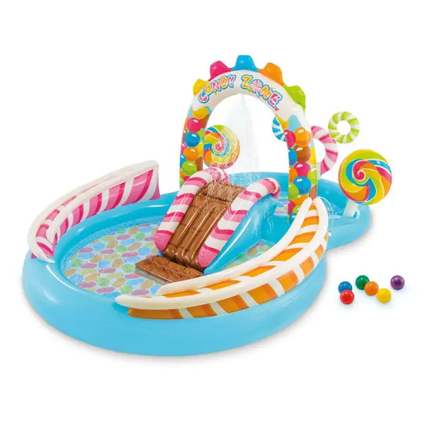 • Igraonica bazen na naduvavanje „Candy Zone“ iz ponude brenda Intex predstavlja savršeno rešenje za letnju zabavu i osveženje najmlađih u dvorištu ili bašti. Ovaj dečiji bazen sa toboganom kombinuje vodene igre, šareni dizajn i bezbednu konstrukciju, stvarajući pravi mali vodeni park u kućnim uslovima. Tematika slatkiša, lizalica i čokolade dodatno podstiče maštu dece i čini igru još zanimljivijom.