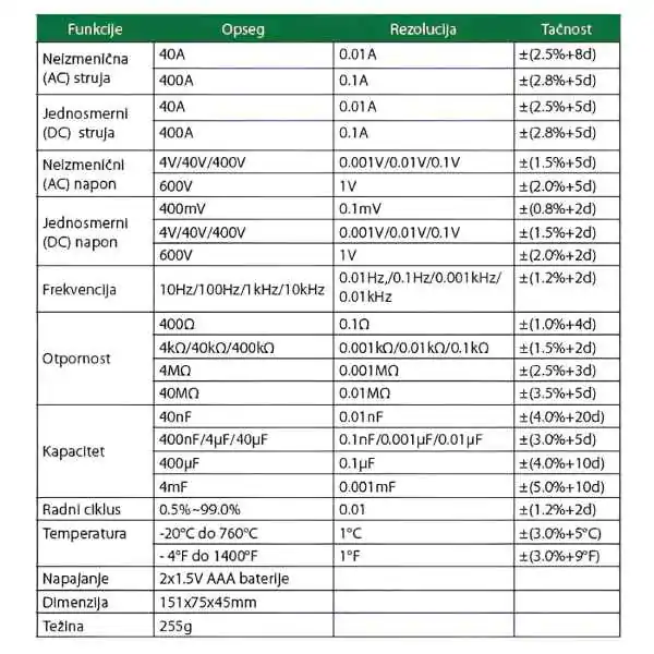 •     400 A (rezolucija 0,1 A, tačnost ±(2,8%+5d))