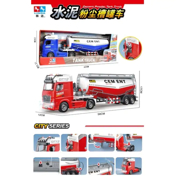 • Realističan kamion cisterna za cement donosi gradilišnu avanturu pravo u dečju sobu ili dvorište! Ovaj impresivni model dizajniran je sa pažnjom na detalje, uključujući otvaranje vrata kabine koja omogućavaju pristup unutrašnjosti i smeštaj vozača. Pritiskom na volan oglašava se truba, dok svetlosni i zvučni efekti dodatno oživljavaju igru i čine je autentičnijom – deca će uživati u realističnim zvucima motora, trube i svetlima koja prate vožnju. Funkcionalno crevo za igru omogućava simulaciju izliva cementa, tako da mali građevinari mogu da pune, prazne i transportuju cement na gradilište baš kao pravi radnici. Prikolica se skida i kači na kamion, što omogućava različite konfiguracije igre – kamion može raditi sam ili sa prikolicom. Dimenzije vozila su 62 x 13.5 x 23 centimetra, što ga čini dovoljno velikim za uočljive detalje, a opakom praktičnim za igru i čuvanje. Dostupno je u dve boje – crvenoj i plavoj. Izrađen je od izdržljive plastike koja podnosi aktivnu igru, padove i graditeljske poduhvate. Savršen za mališane koji vole velike mašine, gradilišta i kreativnu, maštovitu igru. Preporučuje se za decu od 3 godine naviše.