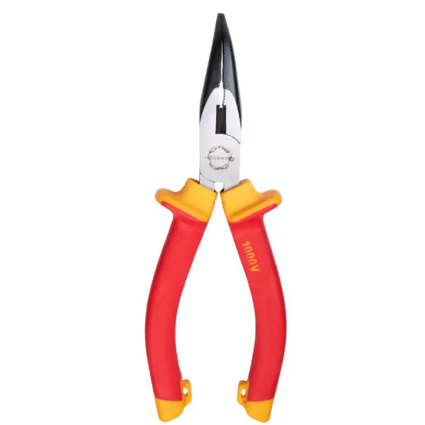 • Ova profesionalna klešta sa savijenim, izduženim vrhom namenjena su preciznom sečenju, savijanju i oblikovanju provodnika i električnih žica, čak i u zahtevnim uslovima rada. Zahvaljujući VDE sertifikatu za napon do 1000 V, potpuno su bezbedna za rad na instalacijama pod naponom, što ih čini idealnim izborom za električare i servisere. Izrađena su od visokokvalitetnog hrom-vanadijum legiranog čelika, otpornog na deformacije, uz dodatni postupak kovanja koji obezbeđuje dugotrajnost i pouzdanost. Sečiva su induktivno kaljena na tvrdoću od 55–60 HRC, što omogućava čisto i precizno sečenje uz minimalan napor. Čvrst zglob sa zakovicom dodatno povećava stabilnost tokom rada. Dvokomponentna, izolovana drška ergonomski je oblikovana za siguran i udoban hvat, dok ugrađeni štitnici sprečavaju kontakt ruke sa provodnim delovima.