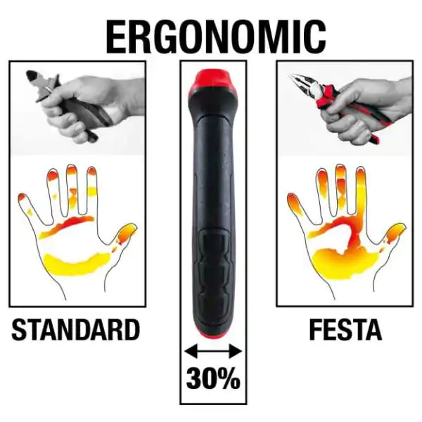 • Zahvaljujući antikorozivnoj zaštiti i ergonomskim dvokomponentnim drškama, rad je udoban i siguran, dok posebno oblikovane tanke, zakrivljene čeljusti omogućavaju lako rukovanje u situacijama kada standardna klešta ne mogu da priđu. Drške pružaju 30% veći kontakt pri pritisku, što smanjuje napor pri radu.