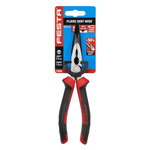• FESTA špicasta kriva klešta dužine 200 mm predstavljaju pouzdan i kvalitetan alat namenjen za precizan rad u uskim i teško dostupnim prostorima. Izrađena od karbonskog čelika sa indukciono kaljenim čeljustima tvrdoće 50–55 HRC, ova klešta obezbeđuju dug vek trajanja i otpornost na habanje.