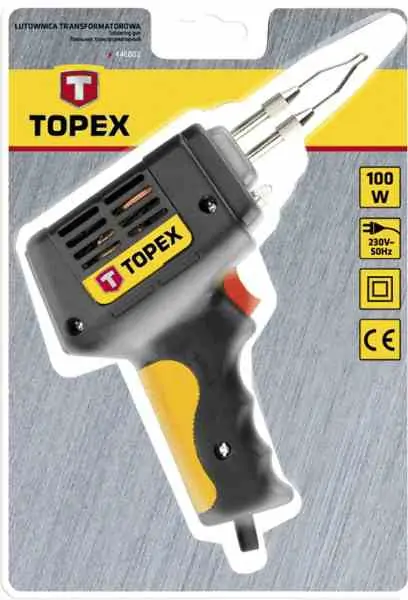 • TOPEX 44E002 je pištoljska lemilica snage 100 W, namenjena za brzo i efikasno lemljenje u električarskim i elektroničkim radovima.