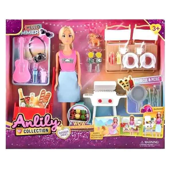 • Ovaj set omogućava mališanima da kroz igru ožive zabavne i kreativne piknik avanture, bilo da se radi o rođendanskom slavlju, porodičnom izletu ili druženju sa prijateljicama. Set uključuje lutku (devojčicu ili devojku) spremnu za piknik – obučenu u letnju, ležernu kombinaciju (haljina, šešir, sandale). Dodaci su izuzetno bogati: roštilj koji se može otvoriti i na koji se stavlja hrana (plastični odresci, kobasice, kukuruz), sto i stolice (sklopive ili fiksne) za postavljanje trpeze, raznovrsna hrana (sendviči, voće, kolači, sladoled) i piće (sokovi, limunada) sa čašama, gitara za muziku i pevanje uz logorsku vatru ili u hladu drveta, fotoaparat za večne uspomene. Dodatni dodaci mogu uključivati piknik korpu, ćebe, tanjire, escajg, suncobran, leptire ili cveće za dekoraciju. Lutka može da sedi za stolom, drži hranu, pije, svira gitaru ili fotografiše. Set podstiče maštu, igru uloga (domaćin, gost, kuvarka, muzičarka, fotograf), kreativne scenarije (planiranje piknika, postavljanje stola, pevanje, fotografisanje). Idealno za decu koja vole društvene igre, piknik avanture, prirodu, druženje i oponašanje odraslih. Preporučuje se za decu od 3 godine naviše.