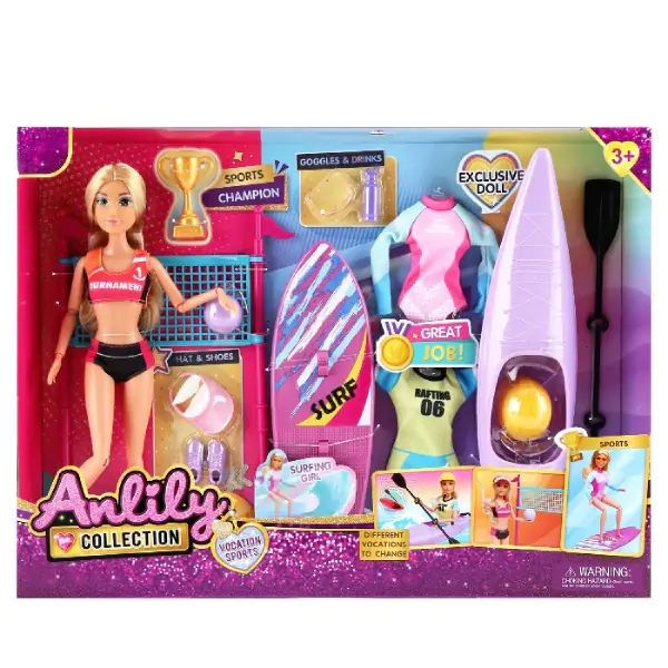 • Ova lutka sportistkinja pruža mališanima zabavu i kreativnu igru kroz različite sportske aktivnosti, podstičući ih na kretanje, zdravu konkurenciju i ljubav prema sportu. Set uključuje lutku sportistkinju, spremnu da se okuša u tri uzbudljiva sporta: odbojka na pesku (sa loptom i mrežom ili podlogom), kajak (sa čamcem, veslima i prslukom za spasavanje) i surfovanje (sa daskom za surf i talasima). Svaki sport dolazi sa svojom odevnom kombinacijom – tri potpuno različita outfita koja se lako menjaju: dres za odbojku (majca, šorc, patike), neopren ili hidro odeća za kajak (dugi rukavi, pantalone, čizme), i kupaći kostim za surfovanje (kombinezon ili bikini, sa zaštitom od sunca). Dodaci za svaki sport omogućavaju realističnu igru – lutka može da servira loptu, vesla kroz brzake, ili uhvati talas. Pokretljivi zglobovi (ruke, noge, glava) omogućavaju prave sportske poze – zalet, udarac, veslanje, balansiranje na dasci. Podstiče aktivnu igru, kreativnost, interesovanje za sport, učenje o različitim sportskim disciplinama, razvija fine motoričke veštine (presvlačenje, držanje dodataka) i samopouzdanje. Savršen poklon za decu koja vole sport, avanture na vodi, pesku i talasima. Preporučuje se za decu od 3 godine naviše.