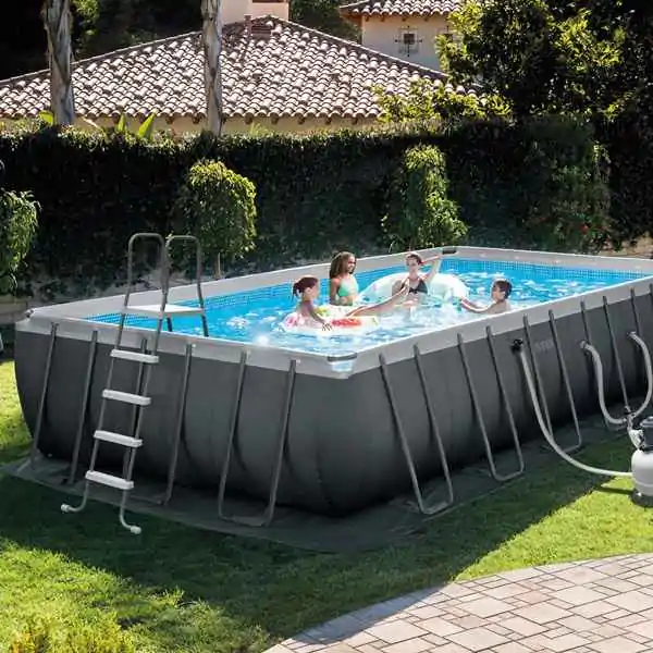 • Konstrukcija obezbeđuje stabilnost i dugovečnost: metalne noge imaju zaštitni premaz i kape za dno, što sprečava oštećenje bazena. Stepenice i platforma od ojacanog ABS plastike opremljene su neklizajućim gazistima za povećanu bezbednost.