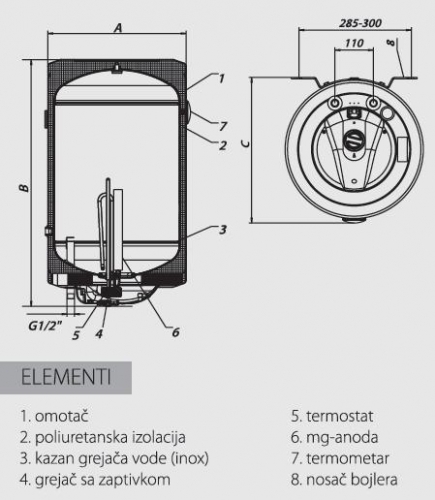 • Materijal za izradu kazana je prohromski čelični lim koji ima odlična antikorozivna svojstva. Toplotna izolacija od poliuretana obezbeđuje da toplotni gubici budu minimalni, odnosno da potrošnja električne energije bude racionalna. Boja: siva
