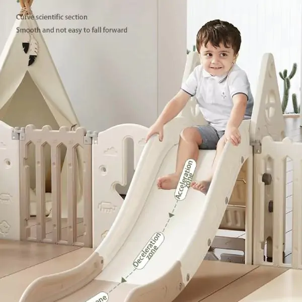 • Ogradica uključuje tobogan sa nosivošću do 40 kg, ljuljašku sa nosivošću do 25 kg, konjića za ljuljanje sa nosivošću do 40 kg, koš za bacanje lopte koji podstiče sportski duh, kabinet za odlaganje igračaka i knjiga, kao i tablu za crtanje koja omogućava umetničke i kreativne aktivnosti. Svi elementi su pažljivo dizajnirani da razvijaju dečiju radoznalost, stvaralaštvo, osećaj ravnoteže i socijalne veštine kroz igru. Izrađena od kvalitetnog HDPE materijala koji je siguran i dugotrajan, ogradica garantuje bezbednost i zdravlje mališana, dok pametan dizajn omogućava jednostavno sklapanje, održavanje i čuvanje.