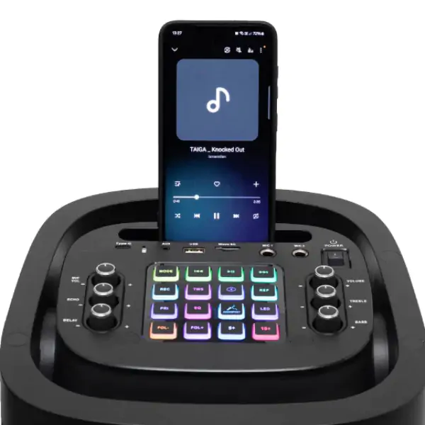 • Ovaj zvučnik predstavlja savršen izbor za sve koji traže moćan zvuk i spektakularne svetlosne efekte u jednom kompaktnom i prenosivom uređaju. Sa 60 W snage i duplim sabvuferom, garantuje dinamičan, pun i uravnotežen zvuk koji ispunjava prostor – bilo da je u pitanju kućna zabava, druženje u bašti ili manji događaji na otvorenom. Zahvaljujući bežičnoj Bluetooth vezi, možete jednostavno puštati muziku sa pametnog telefona, tableta ili drugih uređaja, dok ugrađena baterija omogućava korišćenje bilo gde i bilo kada, bez potrebe za stalnim priključenjem na struju. TWS (True Wireless Stereo) funkcija omogućava povezivanje dve identične zvučne kutije za još snažniji i prostorno bogatiji surround zvuk. Uređaj nudi raznovrsne opcije za reprodukciju muzike – MP3 reprodukciju sa USB ili microSD memorije, FM radio za slušanje omiljenih stanica i AUX audio ulaz za povezivanje drugih uređaja. Spektakularni LED svetlosni efekti koji pulsiraju u ritmu muzike dodatno upotpunjuju atmosferu, a po potrebi se mogu lako isključiti za mirnije okruženje. Funkcija eho stvara profesionalni vokalni efekat, dok KARAOKE režim potiskuje glas originalnog pevača, omogućavajući vam da zablistate u sopstvenom nastupu. Zvuk sa mikrofona može se snimati direktno na USB ili microSD memoriju, kako biste sačuvali i kasnije uživali u nezaboravnim trenucima.