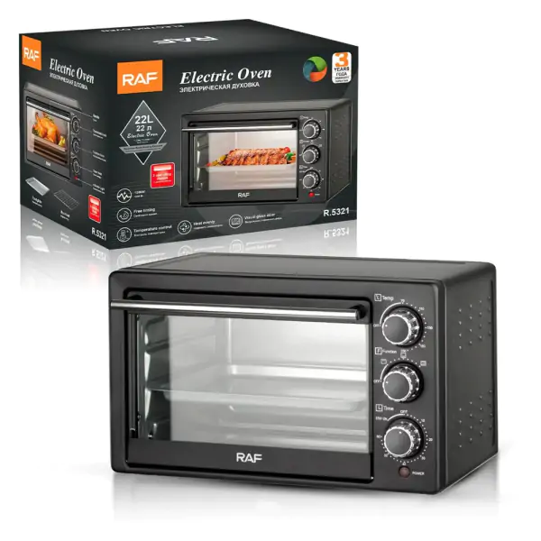 • Raf mini pećnica model R.5321 zapremine 22 litra i snage 1200 W predstavlja svestrano i praktično rešenje za svakodnevnu pripremu obroka, kombinujući dovoljno prostora sa snažnim performansama u elegantnom crnom dizajnu. Opremljena je kontrolom temperature u rasponu od 80 do 230 °C i tajmerom do 60 minuta, što omogućava precizno podešavanje i ravnomerno pečenje peciva, mesa, povrća ili brzo zagrevanje hrane. Kompaktnih dimenzija 43 x 33 x 31 cm i kabla dužine 0,95 m, ova pećnica se lako uklapa u svaki kuhinjski prostor, a uz kompletni pribor koji uključuje pleh za pečenje, rešetku za pečenje i pleh za roštilj, pruža širok spektar mogućnosti za kreativno kuvanje. Ova mini pećnica je idealan izbor za sve koji traže spoj funkcionalnosti, kontrole i modernog dizajna u svakodnevnoj upotrebi.