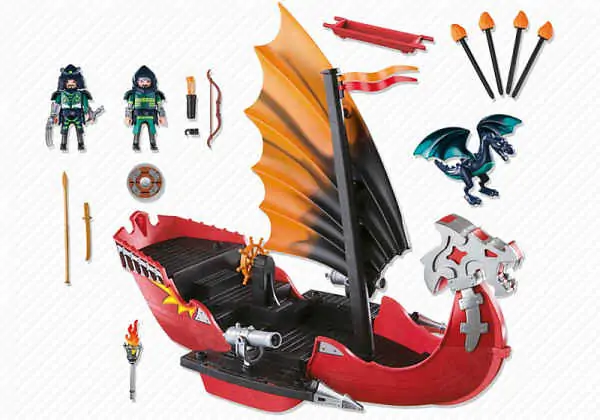 • Playmobil set zmajev borbeni brod sadrži zmaja, dve figure i dva topa.