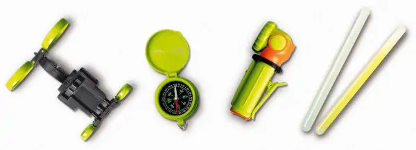 • U sastavu kompleta se nalaze: dvogled sa signalizirajućim ogledalom i uveličavajućim staklom, luksuzni kompas, dva svetleća štapića i lampu sa rotirajućim svetlom.
