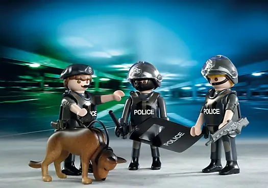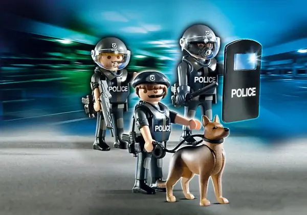 • Set uključuje 3 figure sa policijskim uniformama, policijskog psa, štit i drugi pribor.