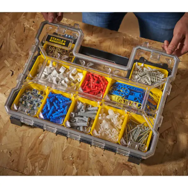 • Predstavljamo vam STANLEY® vodootporni teški organizator – profesionalno rešenje za čuvanje i transport sitnih delova, vijaka, matica, tipli, alata i pribora na najzahtevnijim radnim mestima. Zahvaljujući bravi na bazi zatvarača, kutija je potpuno vodootporna, štiteći sadržaj od kiše, prskanja i vlage. Dizajn poklopca zaključava uklonjive posude na mestu kada je poklopac zatvoren – nema prosipanja, nema pomeranja sadržaja. Metalne brave otporne na rđu garantuju dodatnu izdržljivost i dug vek trajanja, čak i u teškim uslovima na gradilištu. Bočne brave omogućavaju vam da više identičnih STANLEY® FATMAX® organizatora spojite zajedno, stvarajući modularni sistem po vašoj potrebi. Teksturirana ručka za nošenje pruža udobnost i siguran zahvat pri transportu. Unutrašnjost čine 2 velike plitke uklonjive posude i 8 srednje dubokih uklonjivih posuda – savršeno za organizaciju šrafova, burgija, nastavaka, elektro materijala ili ribolovačkog pribora. Dimenzija 43,2 x 6,4 x 33 cm. Organizacija nikada nije bila lakša.