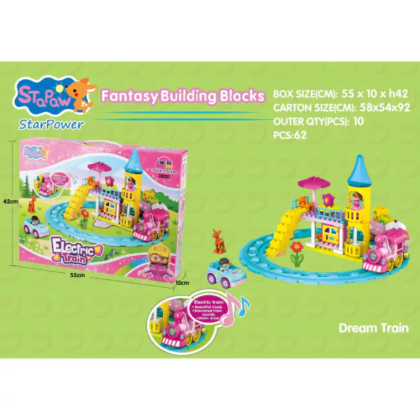 Unesite čaroliju u dečiju igru uz Fantasy Kocke Zamak! Ovaj set sadrži 62 dela, uključujući prugu i vozić na baterije sa zvučnim i svetlosnim efektima (baterije nisu uključene), pružajući deci interaktivnu i zabavnu igru.