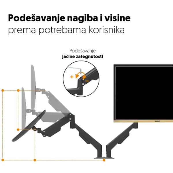 • Zahvaljujući nezavisnom sistemu za oba kraka, korisnik može zasebno podešavati visinu i nagib svakog monitora, čime se obezbeđuje ergonomski položaj sedenja i smanjuje naprezanje očiju i vrata. Nosač podržava nagib ekrana od +45° do -45°, kao i horizontalnu rotaciju od +180° do -180°, što omogućava slobodno pozicioniranje ekrana u željeni položaj.