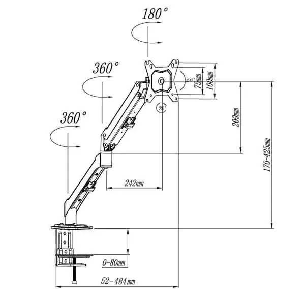 • Nosač se može fiksirati na radni sto pomoću metalne stege ili šarafa, u zavisnosti od debljine i izvedbe površine. Sistem gasne opruge omogućava balansiranje težine monitora, a zategnutost se lako podešava u skladu sa masom uređaja. Konstrukcija izrađena od kvalitetnog metala garantuje dug vek trajanja i čvrsto držanje bez vibracija.