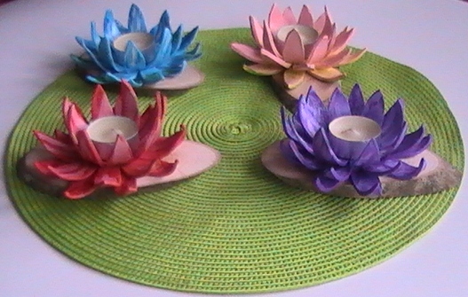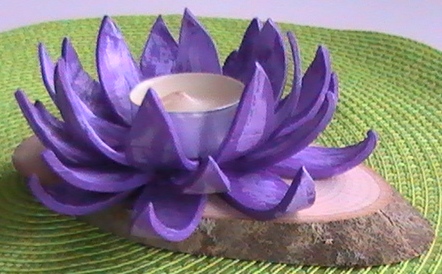 Drveno postolje sa svećnjakom od fimmo mase. Uz svećnjak se dobija i jedna svećica. Prečnik cveta lotosa cca. 14cm. Kartonsko pakovanje dimenzije: 18x14cm.