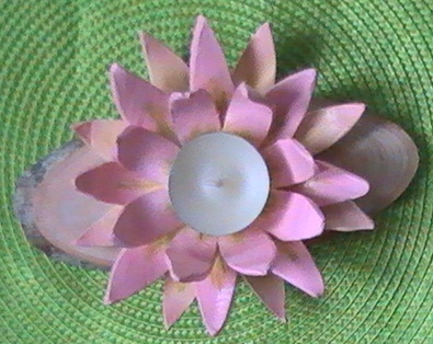 Drveno postolje sa svećnjakom od fimmo mase. Uz svećnjak se dobija i jedna svećica. Prečnik cveta lotosa cca. 14cm. Kartonsko pakovanje dimenzije: 18x14cm.