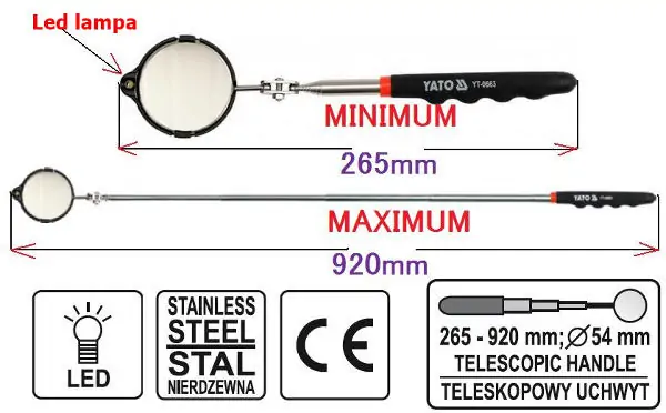 Teleskopsko ogledalo sa LED lampom YatoYATO inspekcijsko teleskopsko ogledalo, je koristan alat u svakoj fabrici, servisu, radionici itdOmogućava vam ...